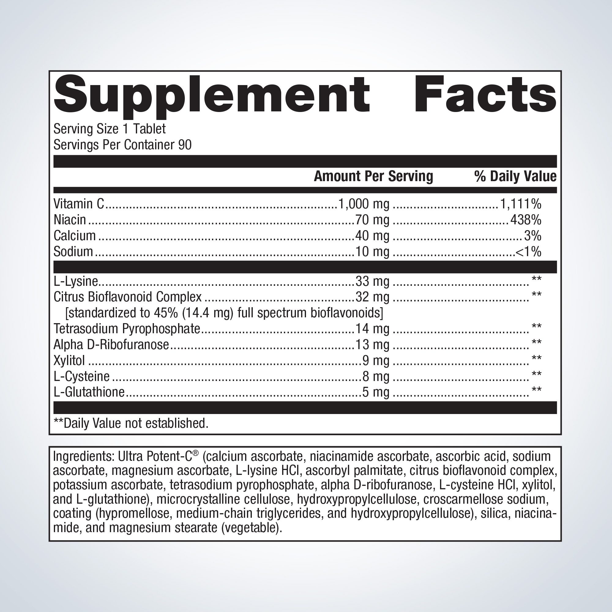 Ingredients: Ultra Potent-C®† (calcium ascorbate, niacinamide ascorbate, ascorbic acid, sodium ascorbate, magnesium ascorbate, L-lysine HCl, ascorbyl palmitate, citrus bioflavonoid complex, potassium ascorbate, tetrasodium pyrophosphate, alpha D-ribofuranose, L-cysteine HCl, xylitol, and L-glutathione), microcrystalline cellulose, croscarmellose sodium, silica, magnesium stearate (vegetable), stearic acid (vegetable), and coating (hypromellose, medium-chain triglycerides, and hydroxypropylcellulose).