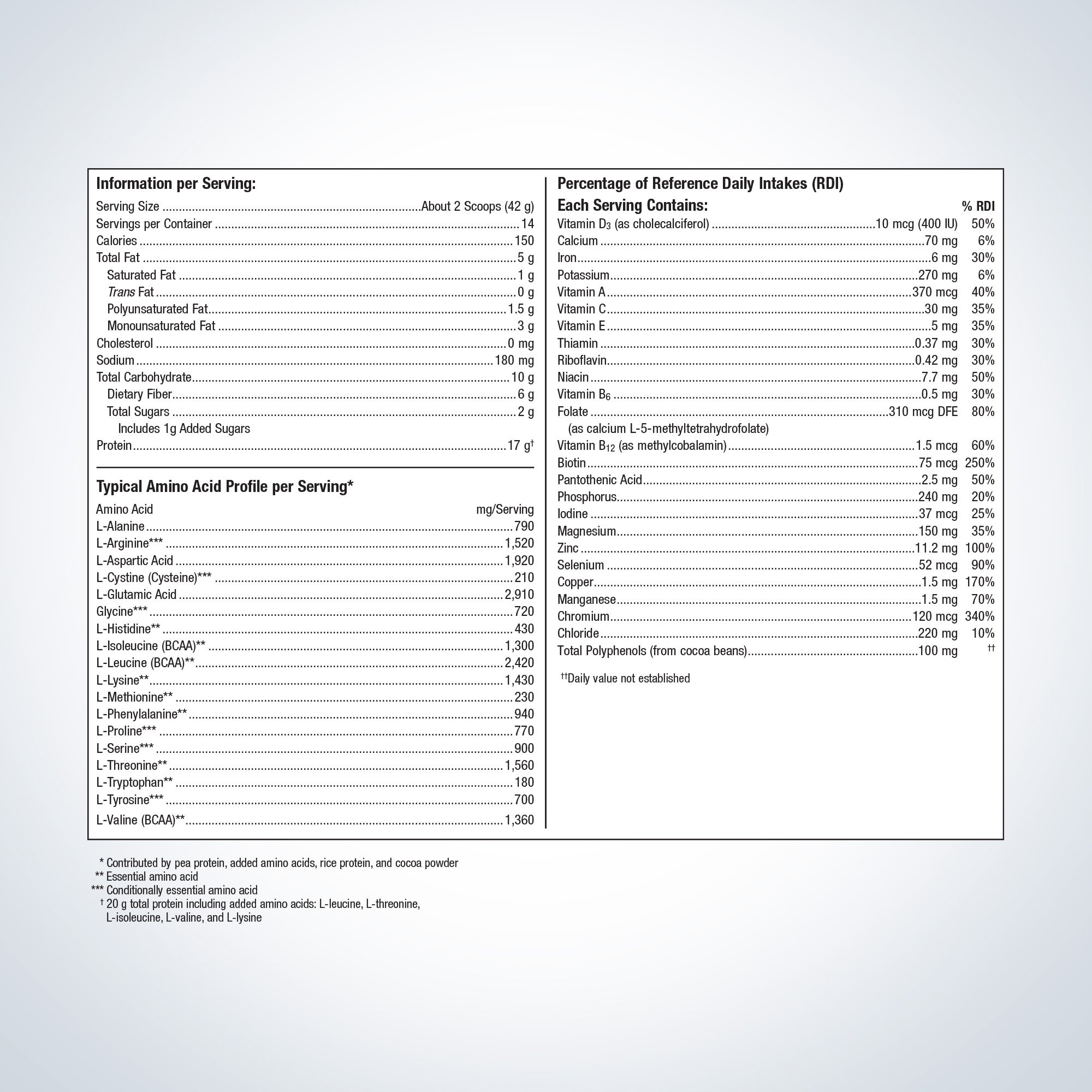 Ingredients: Pea protein isolate, rice protein concentrate, oat hull fiber, olive oil, cocoa powder (processed with alkali), magnesium citrate, natural flavors, ^ L-leucine, dextrose, cocoa powder, L-threonine, silica, gum acacia, L-isoleucine, L-valine, L-lysine HCl, guar gum, vitamin and mineral blend (zinc gluconate, ascorbic acid, manganese gluconate, d-alpha tocopheryl acetate, copper gluconate, D-biotin, retinyl palmitate, niacinamide, cholecalciferol, calcium D-pantothenate, chromium picolinate, pyridoxine HCl, riboflavin, potassium iodide, thiamin HCl, calcium L-5-methyltetrahydrofolate, selenomethionine, and methylcobalamin), xanthan gum, and Luo Han Guo fruit (monk fruit) extract.